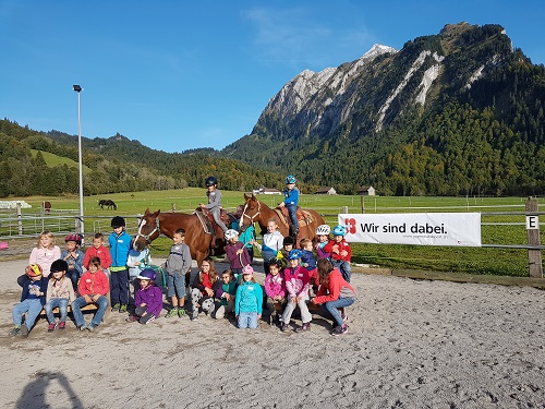 Es macht immer unglaublich Freude, Kinder spielerisch für die Pferde zu begeistern. Für Jungend und Sport ist dies eine zusätzlich Sportstunde in der Schule. Unglaublich ist auch, wie Hoover und Cozy ihre Arbeit mit ihnen erledigen.Aufmerksam und vorsichtig sind die richtigen Worte. Hoover würde es mir nicht verzeihen, wenn er nicht in den Einsatz kommen würde. Bei ihm kann man wirklich sagen, bei Kindern will er mitendrin sein, und sicher nicht nebenan.